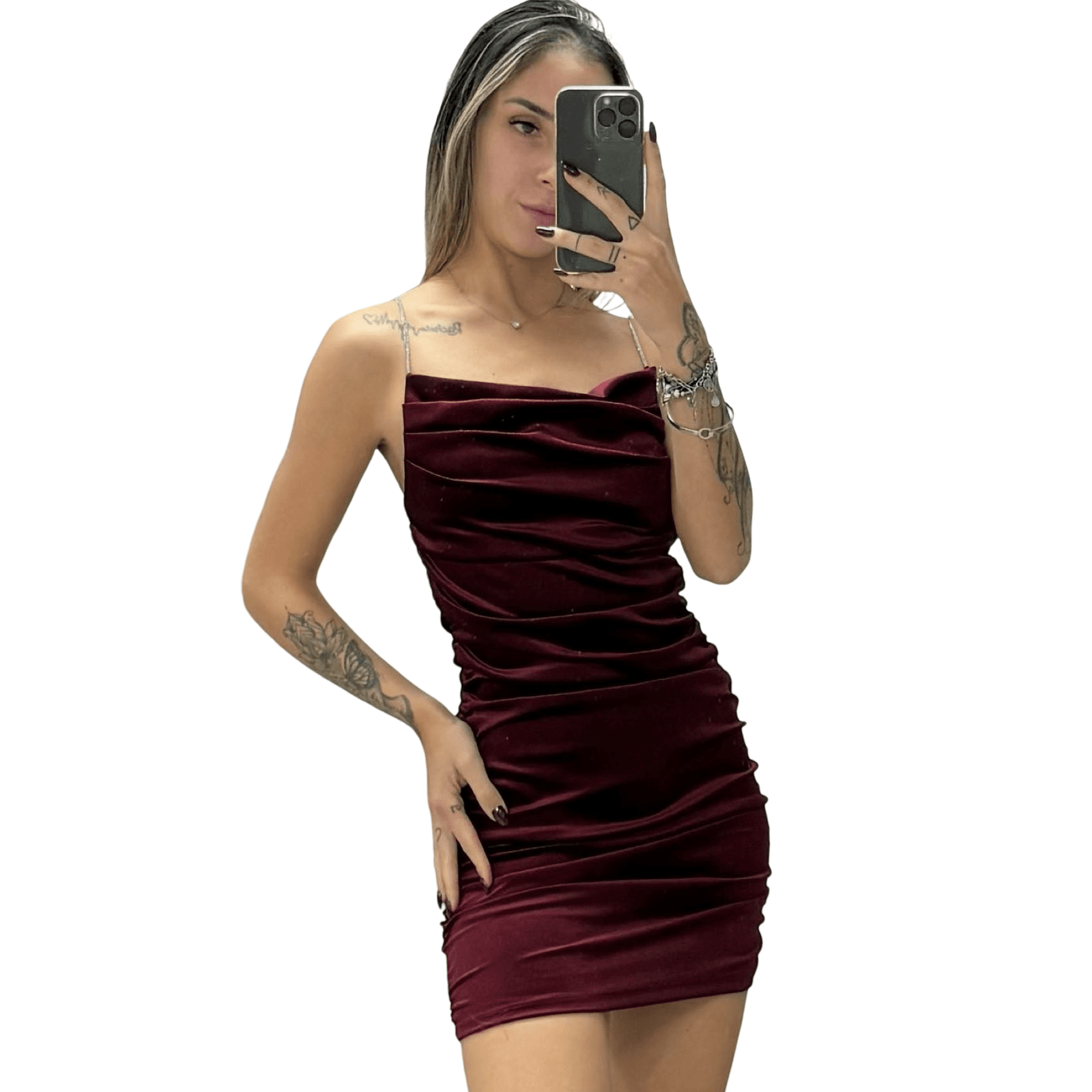 Роклята е от велур. Презрамките са блестящи с камъчета.