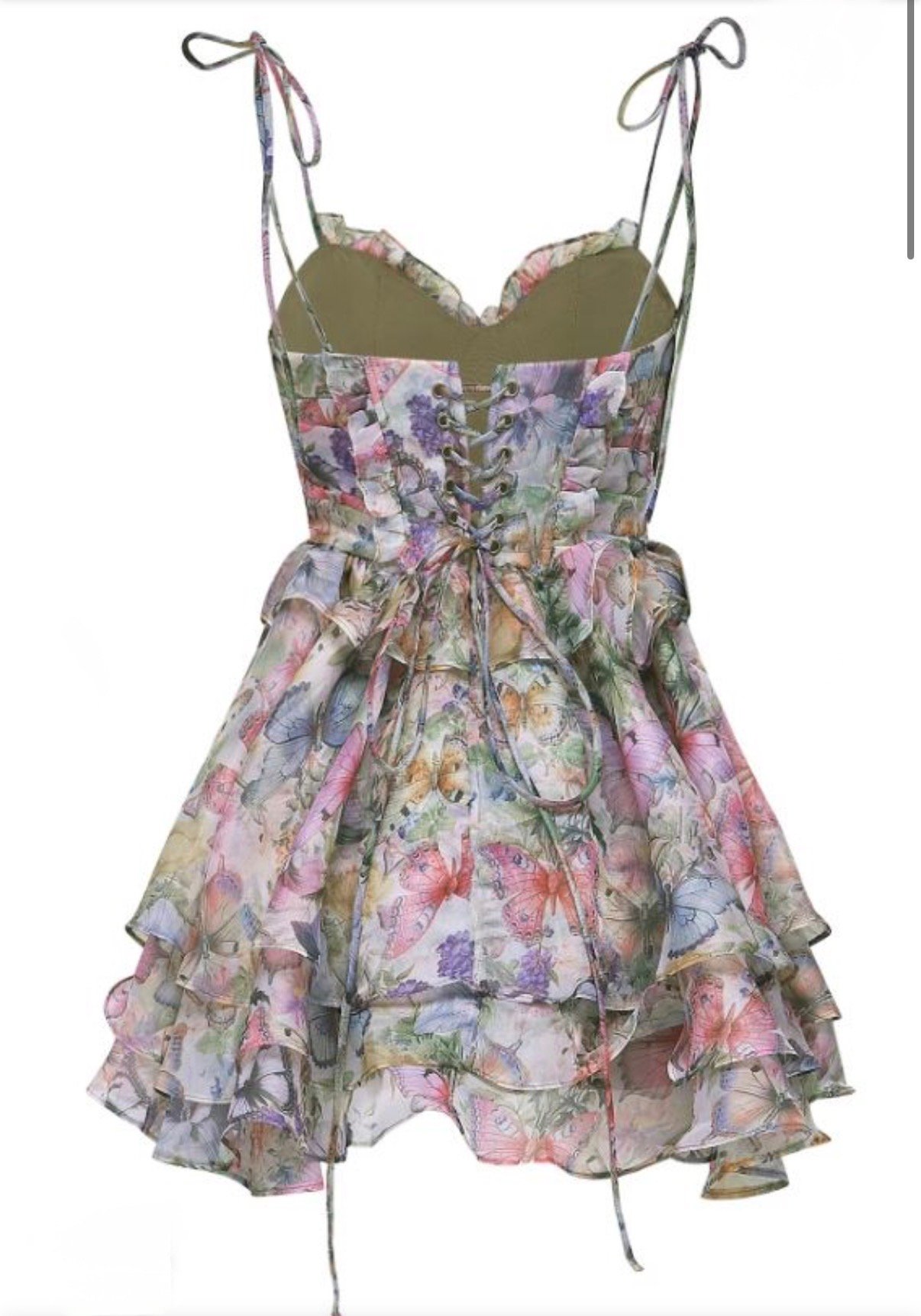 Елегантна дамска рокля с романтичен флорален принт, създадена да подчертае женствеността и изтънчения стил. Моделът е с втален корсет и ефектна връзка на гърба, която позволява перфектно напасване към силуета. Тънките презрамки с връзки придават нежност и лекота на визията, а отвореният гръб добавя изискан акцент.